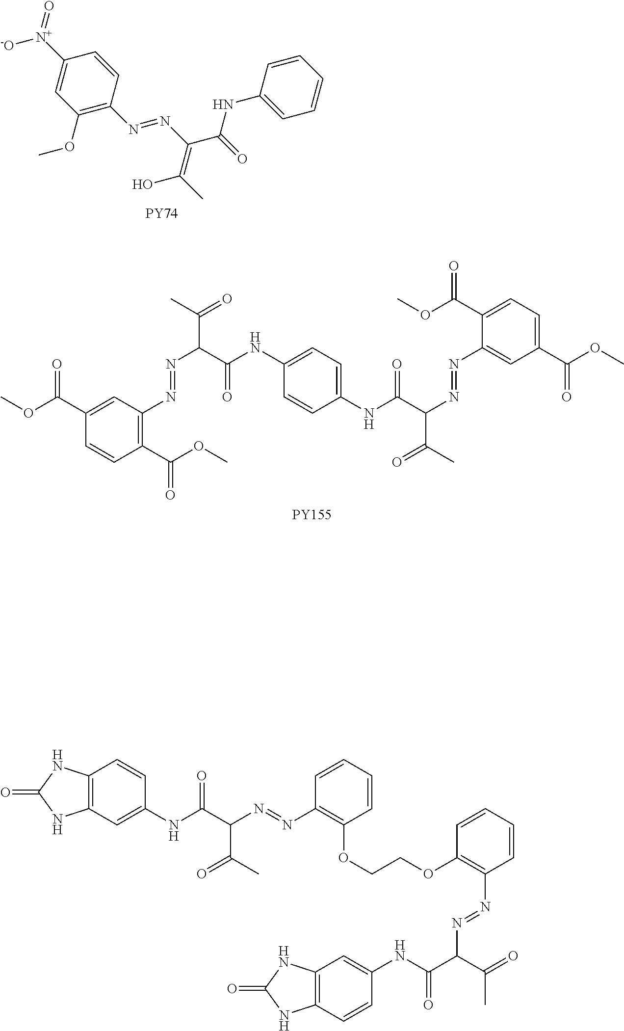 In certain embodiments, the pigment concentrate contains yellow pigments such as PY155 and PY180 which are shown below: