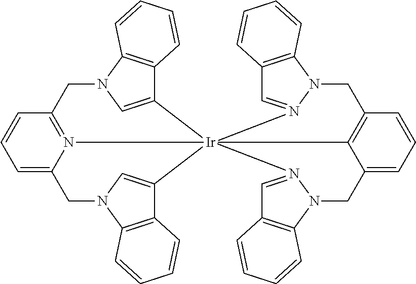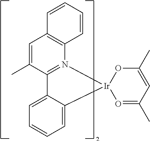 More examples for each of these layers are available. For example, a flexible and transparent substrate-anode combination is disclosed in U.S. Pat. No. 5,844,363, which is incorporated by reference in its entirety. An example of a p-doped hole transport layer is m-MTDATA doped with F.sub.4-TCNQ at a molar ratio of 50:1, as disclosed in U.S. Patent Application Publication No. 2003/0230980, which is incorporated by reference in its entirety. Examples of emissive and host materials are disclosed in U.S. Pat. No. 6,303,238 to Thompson et al., which is incorporated by reference in its entirety. An example of an n-doped electron transport layer is BPhen doped with Li at a molar ratio of 1:1, as disclosed in U.S. Patent Application Publication No. 2003/0230980, which is incorporated by reference in its entirety. U.S. Pat. Nos. 5,703,436 and 5,707,745, which are incorporated by reference in their entireties, disclose examples of cathodes including compound cathodes having a thin layer of metal such as Mg:Ag with an overlying transparent, electrically-conductive, sputter-deposited ITO layer. The theory and use of blocking layers is described in more detail in U.S. Pat. No. 6,097,147 and U.S. Patent Application Publication No. 2003/0230980, which are incorporated by reference in their entireties. Examples of injection layers are provided in U.S. Patent Application Publication No. 2004/0174116, which is incorporated by reference in its entirety. A description of protective layers may be found in U.S. Patent Application Publication No. 2004/0174116, which is incorporated by reference in its entirety.
