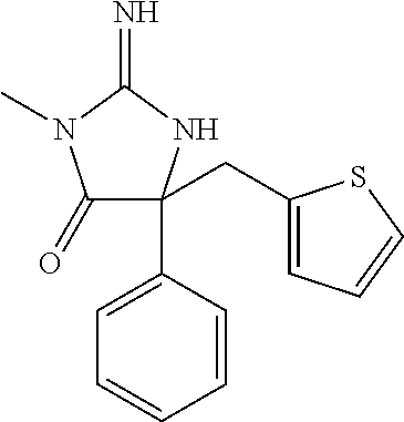 - ZKYGWJUBWFSWEG-UHFFFAOYSA-N CC(C)CC1(C)/C(=N/CC2=CC=CC=C2)NC(=N)N1CCC1=CC=CC(Cl)=C1 Chemical compound CC(C)CC1(C)/C(=N/CC2=CC=CC=C2)NC(=N)N1CCC1=CC=CC(Cl)=C1 ZKYGWJUBWFSWEG-UHFFFAOYSA-N 0.000 description 2