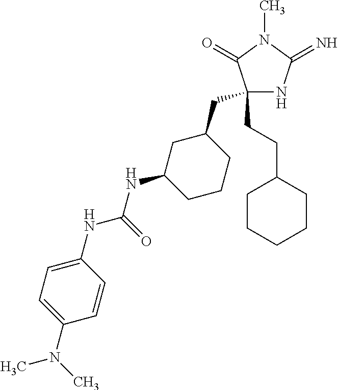 - JEMGGNUFJYUBFD-UHFFFAOYSA-N CC(C)CC1(C)NC(=N)N(CC2=CC=C(CNC(=O)NCC3=CC=C(Cl)C(Cl)=C3)C=C2)C1=O Chemical compound CC(C)CC1(C)NC(=N)N(CC2=CC=C(CNC(=O)NCC3=CC=C(Cl)C(Cl)=C3)C=C2)C1=O JEMGGNUFJYUBFD-UHFFFAOYSA-N 0.000 description 2