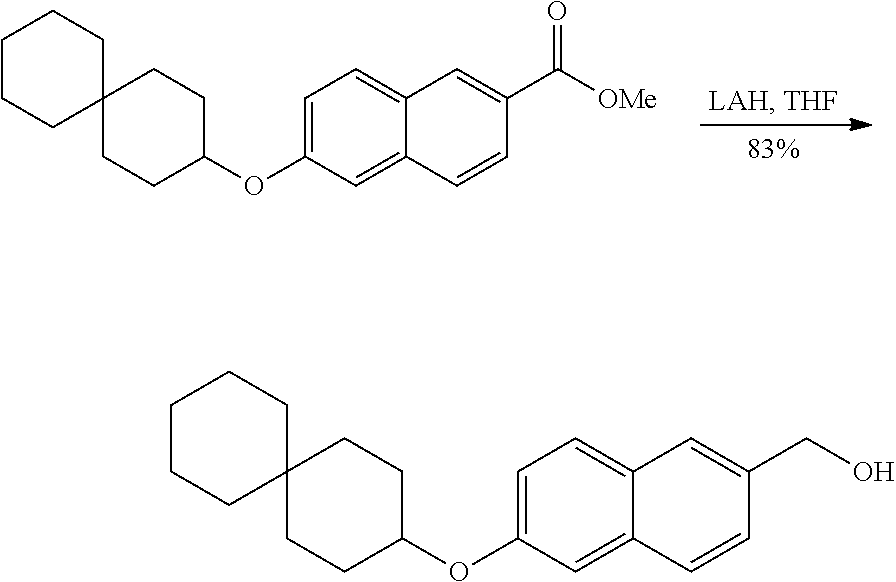 6-(Spiro[4.5]dec-8-yloxy)-naphthalene-2-carboxylic acid methyl ester (0.312 g, 0.000922 mol) in tetrahydrofuran (9 mL, 0.1 mol) and 1.0 M of lithium tetrahydroaluminate in tetrahydrofuran (2.76 mL, 0.00276 mol) was added at 0° C. After stirring at rt for 2 h, quench with EtOAc, then Rochele's salt was added and stirred at rt for 1 h. Extraction with EtOAc, c/c give the product as a white solid (257.2 mg, 90%). LCMS Rt=2.21 min m/z=293.30 ([M-17], 100%).