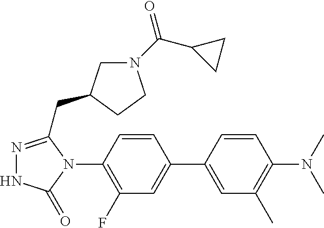 - HIWKJKDFDOSDEG-HNNXBMFYSA-N CC1=CC(C2=CC(F)=C(N3C(=O)NN=C3C[C@@H]3CCN(C(=O)C4CC4)C3)C(F)=C2)=CC=C1C#N Chemical compound CC1=CC(C2=CC(F)=C(N3C(=O)NN=C3C[C@@H]3CCN(C(=O)C4CC4)C3)C(F)=C2)=CC=C1C#N HIWKJKDFDOSDEG-HNNXBMFYSA-N 0.000 description 2