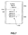 The hysteresis hierarchical menu area 106 a is such an area in which the hysteresis information from the hysteresis from the past operations up to the current hierarchy is displayed, responsive to the actuation on the operating unit 102, and in which the user's selective operation is carried out with the use of the operating unit 102. As the hierarchy increases, the row is enhanced, from e.g., the [top menu “Top Menu”], [ . . . menu A-1 “ . . . Menu A-1”], with the current layer [menu A-1 “Menu A-1”] being demonstrated in the lowermost layer. It is noted that indents or marks 107 denote that the structure specified is a hierarchical structure. On movement and selection by the operating unit 102, reversion may be made directly to the hierarchy, as will be explained subsequently.