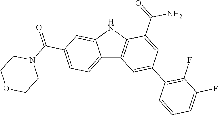 | 568 | | 3-(2,6-difluoro-4-pyridinyl)-7- (4-morpholinylcarbonyl)-9H- carbazole-1-carboxamide | 4.10 | 437 |