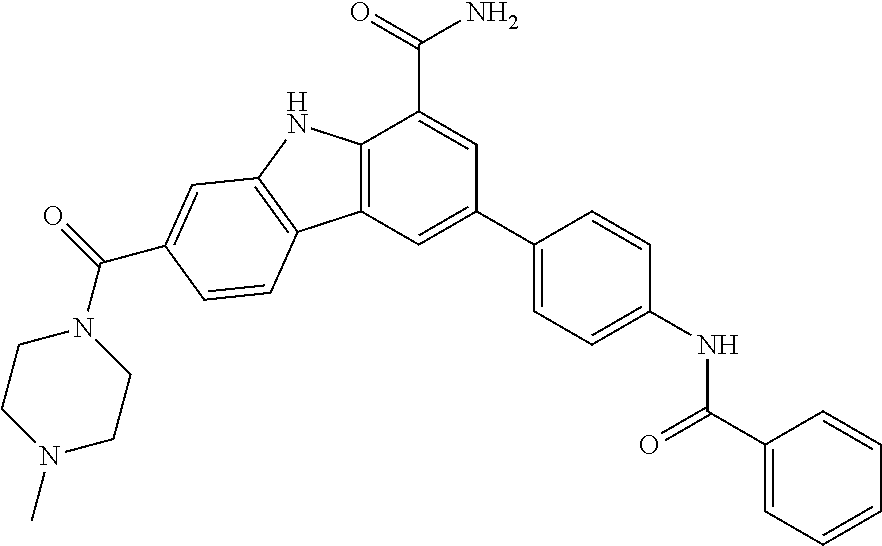 | 574 | | 7-(4-morpholinylcarbonyl)-3- (4-(4-morpholinyl)phenyl)-9H- carbazole-1-carboxamide | 3.63 | 485 |