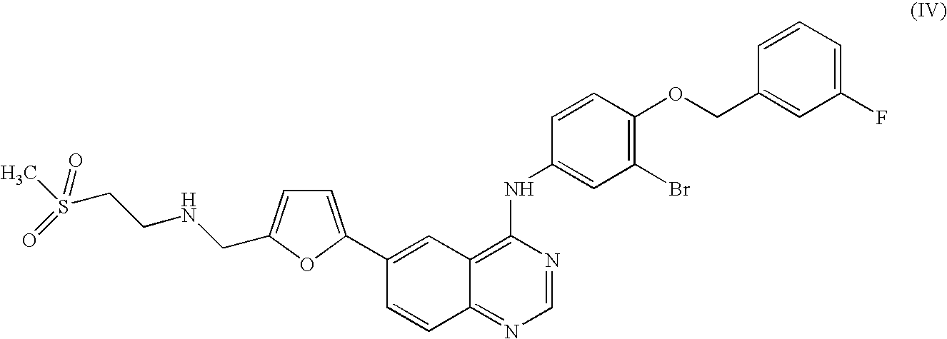 The compound of formula (IV) is (4-(3-Fluoro-benzyloxy)-3-bromophenyl)-(6-(5-((2-methanesulphonyl-ethylamino)-methyl)-furan-2-yl)quinazolin-4-yl)-amine. In one embodiment, the compound is the ditosylate salt of the compound of formula III.