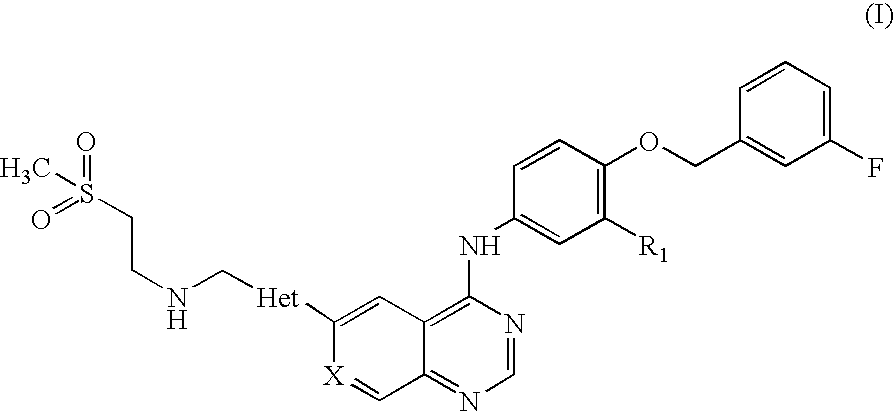 The side chain CH3SO2CH2CH2NHCH2 of the compounds of formula (I) may be linked to any suitable position of the group Het. Similarly, the phenyl group of the quinazoline core may be linked to any suitable position of the group Het.