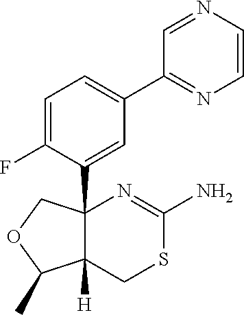 - (4aS,5R,7aS)-7a-(2-fluoro-5-(2-(pyrazin-2-yl)-1H-imidazol-5-yl)phenyl)-5-methyl-4a,5,7,7a-tetrahydro-4H-furo[3,4-d][1,3]thiazin-2-amine,