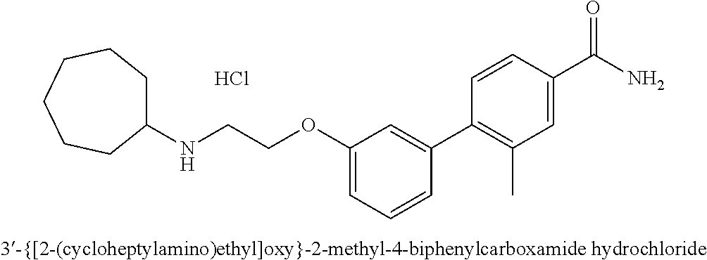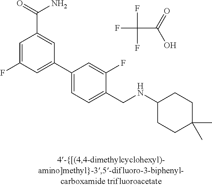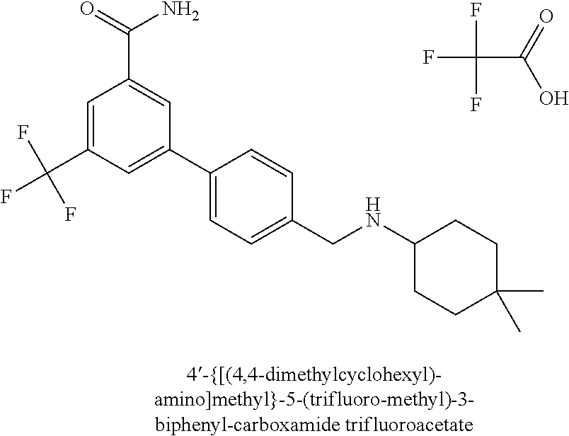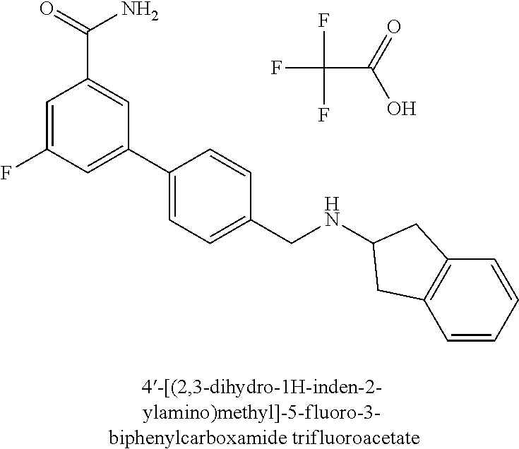 Particularly preferred compounds of Formula I are selected from the group consisting of 4′-{[(4,4-dimethylcyclohexyl)amino]methyl}-3-biphenylcarboxamide; 4′-[(2,3-dihydro-1H-inden-2-ylamino)methyl]-3-biphenylcarboxamide; N-{[3′-(1H-imidazol-2-yl)-4-biphenylyl]methyl}-2,3-dihydro-1H-inden-2-amine; 4′-{[(4,4-dimethylcyclohexyl)amino]methyl}-2-fluoro-3-biphenylcarboxamide; 4′-{[(4,4-dimethylcyclohexyl)amino]methyl}-2-methyl-3-biphenylcarboxamide; 4′-{[(4,4-dimethylcyclohexyl)amino]methyl}-2′-(trifluoromethyl)-3-biphenylcarboxamide; 3′-fluoro-4′-({[(2S)-5-fluoro-2,3-dihydro-1H-inden-2-yl]amino}methyl)-3-biphenylcarboxamide; 1-{4′-[(2,3-dihydro-1H-inden-2-ylamino)methyl]-3-biphenylyl}-2,4-imidazolidinedione; N-{[3′-(1H-imidazol-2-yl)-4-biphenylyl]methyl}-4,4-dimethylcyclohexanamine; N-{[3,5-difluoro-3′-(1H-imidazol-2-yl)-4-biphenylyl]methyl}-2,3-dihydro-1H-inden-2-amine; N-{[3,5-difluoro-3′-(1H-1,2,4-triazol-3-yl)-4-biphenylyl]methyl}-4,4-dimethylcyclohexanamine; N-{[3,5-difluoro-3′-(1H-1,2,4-triazol-3-yl)-4-biphenylyl]methyl}-2,3-dihydro-1H-inden-2-amine; and 2′-chloro-4′-{[(4,4-dimethylcyclohexyl)amino]methyl}-3-biphenylcarboxamide, including their salts, solvates, and physiologically functional derivatives. The preferred salts of these named compounds are a citrate, phosphate, or hydrochloride salt (mono- and di-). Tautomers of these compounds and their salts are also preferred.