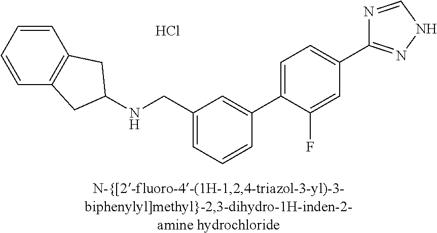 The most preferred compound is N-{[3,5-difluoro-3′-(1H-1,2,4-triazol-3-yl)-4-biphenylyl]methyl}-2,3-dihydro-1H-inden-2-amine or a salt thereof. A citrate, phosphate or mono- or di-hydrochloride salt of N-{[3,5-difluoro-3′-(1H-1,2,4-triazol-3-yl)-4-biphenylyl]methyl}-2,3-dihydro-1H-inden-2-amine is especially preferred.