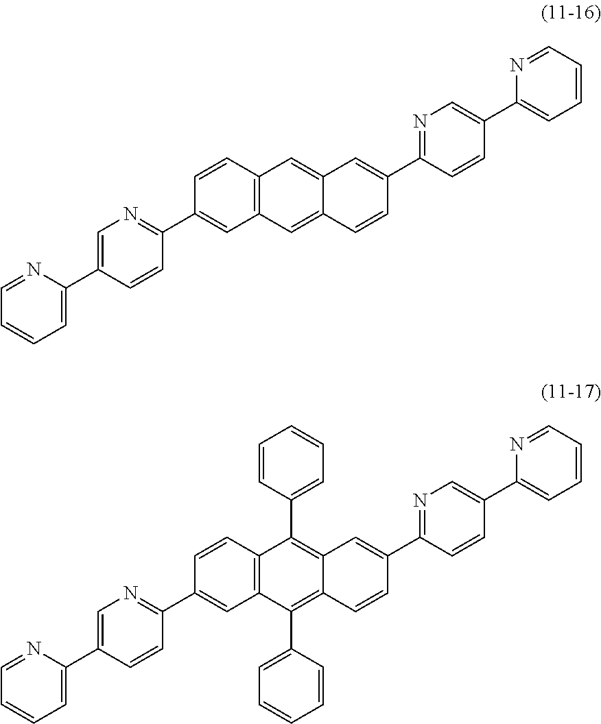 A concrete example of the compound expressed by the general formula (2) includes compounds expressed by the following structural formulas (2-1) to (2-96). It is noted that although the compounds having a carbazole group and an indole group, for example, are given as the nitrogen-containing hydrocarbon groups coupled to L1 here, the present disclosure is by no means limited thereto. For example, an imidazole group may be used.