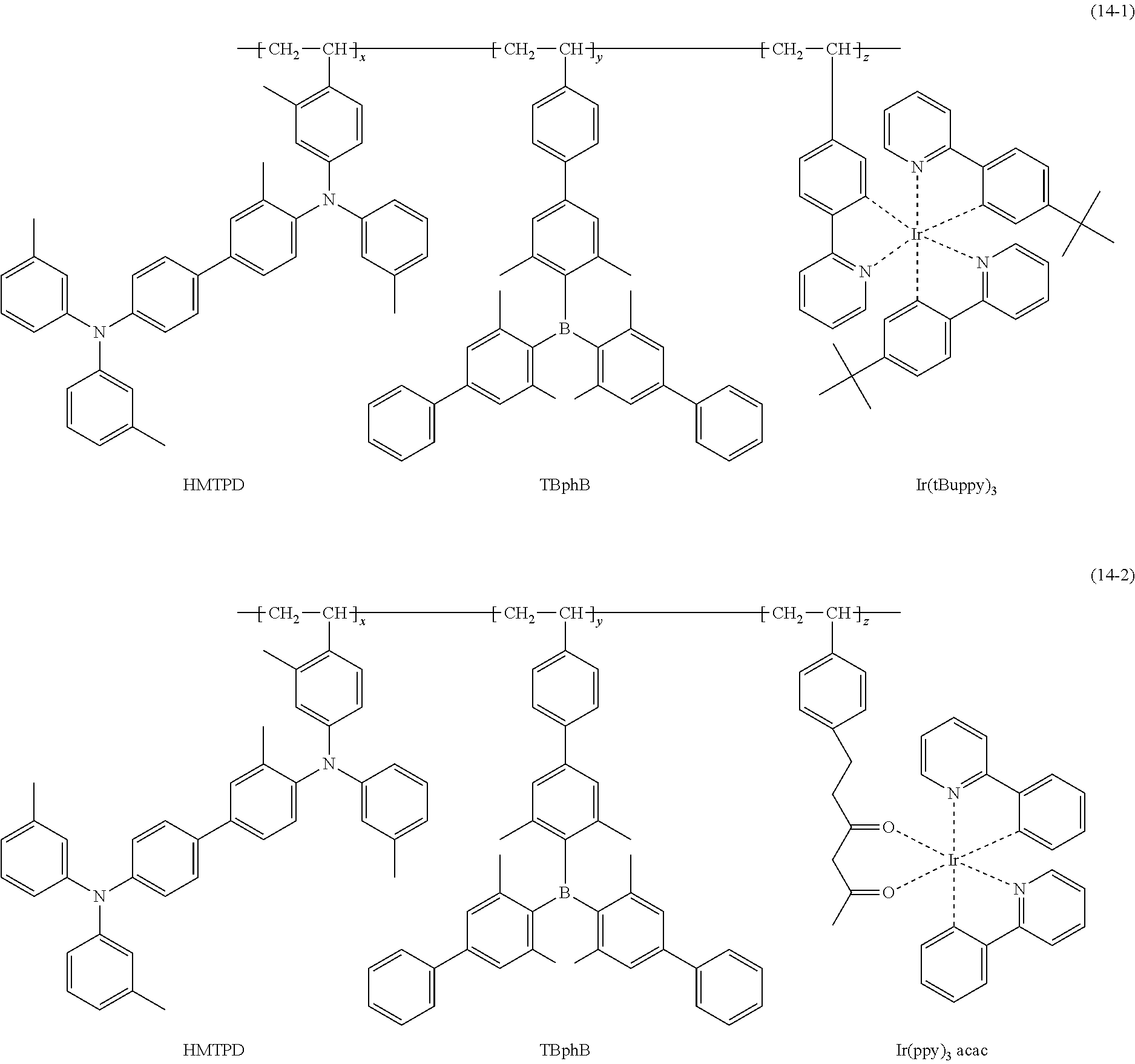 Although as a concrete example of the compound shown in the general formula (1), for example, compounds expressed by the following structural formulas (1-1) to (1-3): poly[(9,9-dioctyl fluorenyl-2,7-diyl)-co-(4,4′-(N-(4-sec-butyl phenyl))diphenylamine)] (TFB, the structural formula (1-1)); poly[(9,9-dioctyl fluoreny-2,7-diyl)-alt-co-(N,N′-bis{4-butylphenyl}-benzidine N,N′-{1,4-diphenylene})] (the structural formula (1-2)); and poly[(9,9-dioctyl fluorenyl-2,7-diyl)] (PFO, the structural formula (1-3)) are preferable, the present disclosure is by no means limited thereto.