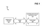 FIG. 1 shows a system 100 in which SNMP management occurs by a managing device 102 in relation to a distributed device architecture 104, according to an example of the disclosure. The managing device 102 communicates with the distributed device architecture 104 over a network, such as the Internet, an intranet, an extranet, and so on. The managing device 102 may be a client computing device, like a laptop or desktop computer, by which a network administrator manages and administers the distributed device architecture 104.