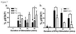 FIG. 7.a) Synergy of IFN-β and IFN-γ for STAT1 activation. Spleen cells C57BL/6 were stimulated with IFN-β or IFN-γ or both for 0, 15, 30 and 60 mins and phosphorylation of STAT1 in CD4 T-cells was assessed by flow cytometry. b) IFN-β requires IFN-γ for optimal STAT1 signaling. C57BL/6 and IFNγR−/−spleen cells were stimulated with IFN- β 0, 15, 30 and 60 mins and phosphorylation of STAT1 in CD4 T-cells was assessed by flow cytometry.