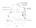 - FIG. 1 Example of a single head embroidery machine showing components where spools of thread are held on spindle stand and spindles marked 101 & 102 respectively. Other parts are marked as points of reference.