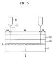 Next, as shown in FIG. 3, the display substrate 100 may be inverted, and the frit adhesive layer 3 of the display substrate 100 may be attached on the mold-releasing layer 2 of the support substrate 1. In this case, a display portion PA of the display substrate 100 may contact the mold-releasing layer 2 of the support substrate 1. In this case, by radiating a laser beam 5 (that is generated in a laser generating device 50) to the frit adhesive layer 3 and instantaneously melting and condensing the frit adhesive layer 3, the display substrate 100 and the support substrate 1 may be attached.