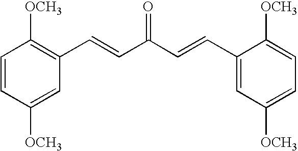 Curcumin also inhibits the activation of NFκB (Bharti et al., (2003) Blood 101, 1053-1062), which may explain its anti-inflammatory properties. Curcumin was shown to attenuate the plasma inflammatory cytokine surge and cardiomyocyte apoptosis following cardiac ischemia/reperfusion in experimental animals by inhibiting activation of NFκB. Yeh et al., (2005) J Surg Res 125, 109-110. Curcumin suppressed NOS induction in LPS-stimulated macrophages by inhibiting the activation of NFκB. Pan et al., (2000) Biochem Pharmacol 60, 1655-1676. Likewise, curcumin inhibited mitogen stimulation of lymphocyte proliferation by inhibiting activation of NFκB. Ranjan et al., (2004) J Surg Res 121, 171-177. Of particular interest is the report that curcumin inhibits the activation of NFκB in BV2 microglia cells (Kang et al, (2004) J Pharmacol Sci 94, 325-328). The limited bioavailability of curcumin (Garcea et al., (2004) Br J Cancer 90, 1011-1015) suggests that clinical use of this natural product will be limited and points to the need to develop curcumin analogs with improved properties including improved bioavailability.