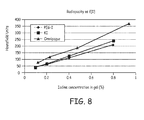 FIG. 8 is a plot of radiopacity as a function of iodine concentration, with an iodinated polyethylene glycol (PEG-I), potassium iodide (KI) and iodine (OMNIPAQUE) being compared.