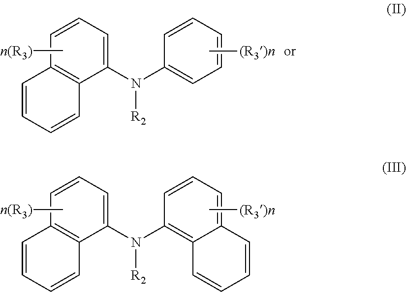 Thus, amines substituted by at least one naphthyl group are much more compatible with, and stable under, applied voltage conditions, such as encountered in the operation of a battery, than amines substituted by phenyl but not naphthyl. The better suitability of naphthyl amines for battery application appears to be general for battery applications in the range of 1-12 V or greater, for example 1-9 V, 1-6V, 1-5V or 1-4V.