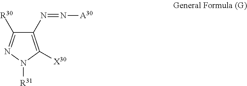 Namely, in the general formula (M), it is preferable that R4 and R9 each independently represent a hydrogen atom, an alkyl group, an alkenyl group, an aryl group, a heterocyclic group, a silyl group, a hydroxyl group, a cyano group, an alkoxy group, an aryloxy group, a heterocyclic oxy group, an acyl group, an alkoxycarbonyl group, a carbamoyl group, an amino group, an anilino group, a heterocyclic amino group, a carbonamido group, a ureido group, an imido group, an alkoxycarbonylamino group, an aryloxycarbonylamino group, a sulfonamido group, an azo group, an alkylthio group, an arylthio group, a heterocyclic thio group, an alkylsulfonyl group, an arylsulfonyl group, or a phosphinoylamino group; R5 and R8 each independently represent a hydrogen atom, a halogen atom, an alkyl group, an alkenyl group, an aryl group, a heterocyclic group, a hydroxyl group, a cyano group, a nitro group, an alkoxy group, an aryloxy group, a heterocyclic oxy group, an acyl group, an alkoxycarbonyl group, an aryloxycarbonyl group, a carbamoyl group, an imido group, an alkoxycarbonylamino group, a sulfonamido group, an azo group, an alkylthio group, an arylthio group, a heterocyclic thio group, an alkylsulfonyl group, an arylsulfonyl group, or a sulfamoyl group; R6 and R7 each independently represent a hydrogen atom, a halogen atom, an alkyl group, an alkenyl group, an aryl group, a heterocyclic group, a silyl group, a hydroxyl group, a cyano group, an alkoxy group, an aryloxy group, a heterocyclic oxy group, an acyl group, an alkoxycarbonyl group, a carbamoyl group, an anilino group, a carbonamido group, a ureido group, an imido group, an alkoxycarbonylamino group, a sulfonamido group, an azo group, an alkylthio group, an arylthio group, a heterocyclic thio group, an alkylsulfonyl group, an arylsulfonyl group, a sulfamoyl group, or a phosphinoylamino group; R10 represents a hydrogen atom, a halogen atom, an alkyl group, an aryl group, or a heterocyclic group; and the metal atom or the metal compound is Zn, Mg, Si, Pt, Pd, Mo, Mn, Cu, Ni, Co, TiO, or VO.