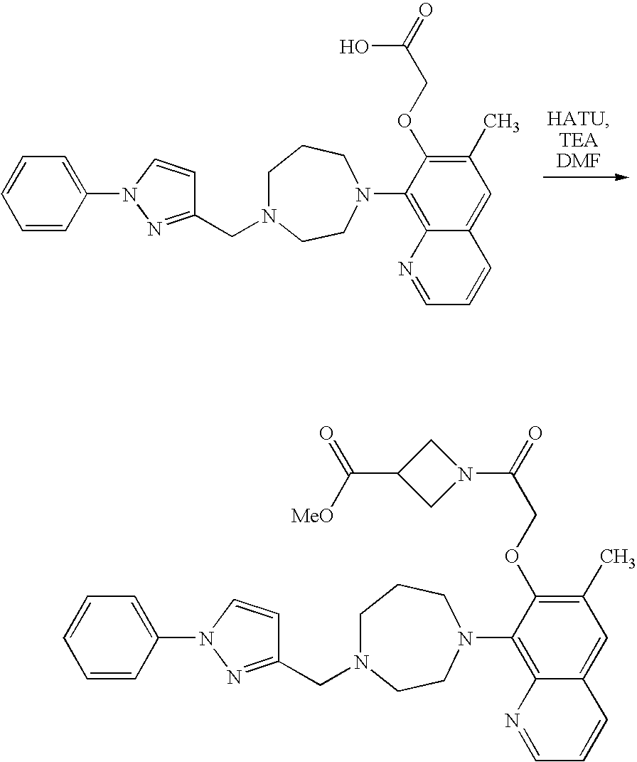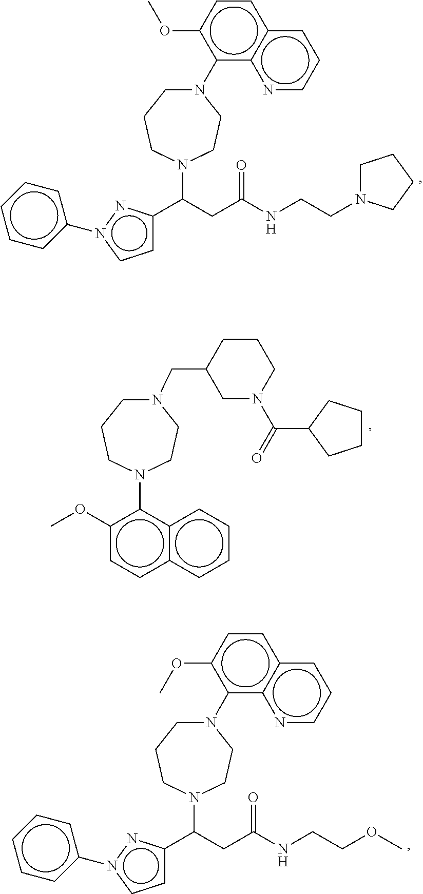 In these assays, MCF-7 and/or MDA-MB-435S cells were interrogated with the target compounds and the ability of these compounds to displace 125I radiolabeled SDF-1 was assessed using the protocol described in Dairaghi and Gosling. The target compounds were added to the plate to the indicated concentration and were then incubated with cells followed by the addition of radiolabeled chemokine (125I SDF-1) for 3 hr at 4° C. in the following binding medium (25 mM HEPES, 140 mM NaCl, 1 mM CaCl2, 5 mM MgCl2 and 0.2% bovine serum albumin, adjusted to pH 7.1). All assays were then incubated for 3 hrs at 4° C. with gentle agitation. Following incubation in all binding assays, reactions were aspirated onto PEI-treated GF/B glass filters (Packard) using a cell harvester (Packard) and washed twice (25 mM HEPES, 500 mM NaCl, 1 mM CaCl2, 5 mM MgCl2, adjusted to pH 7.1). Scintillant (MicroScint 10, Packard) was added to the wells, and the filters were counted in a Packard Topcount scintillation counter. Data were analyzed and plotted using GraphPad Prism (GraphPad Software).