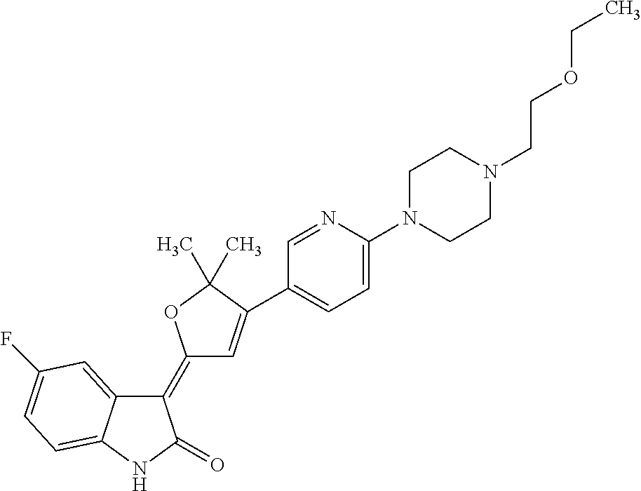A mixture of (3E)-6-fluoro-3-[4-(2-fluoropyridin-4-yl)-5,5-dimethylfuran-2(5H)-ylidene]-1,3-dihydro-2H-indol-2-one (50 mg, 0.15 mmol) and 2-(2-(piperazin-1-yl)ethoxy)ethanol (50 mg, 0.29 mmol) in 2 mL of DMSO was heated in 105° C. bath for 6 hours. The mixture was cooled to room temp and poured into 100 mL of water. The precipitates were filtered, washed with water and dried in vacuo to give (3E)-6-fluoro-3-[4-(2-{4-[2-(2-hydroxyethoxy)ethyl]piperazin-1-yl}pyridin-4-yl)-5,5-dimethylfuran-2(5H)-ylidene]-1,3-dihydro-2H-indol-2-one as a brown solid. Yield: 64 mg, 89%.