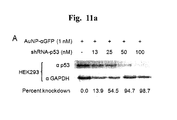 Next, shRNA specific to the p53 gene was synthesized in vitro and annealed to αEGFP oligos that were covalently cross-linked to AuNP, and the resulting conjugates were applied to HEK293 cells. The shRNA to the p53 gene (shRNA-p53) contained a sequence complementary to αEGFP oligo followed by a 67 nucleotide-sequence that forms a hairpin (FIG. 10). The hairpin functions as short interfering RNA and contains inverted direct repeats corresponding to an internal coding region of p53 (bases 895 to 913) flanked by a loop composed of 9 nucleotides [16]. AuNP•αEGFP•shRNA-p53 conjugates were applied to HEK293 cells and protein samples were prepared from the cultures 24 hours after transfection for quantitative analysis of p53 using western blot analysis. As shown in FIG. 11A, AuNP•αEGFP•shRNA-p53 conjugates efficiently knocked down p53 expression in an shRNA-p53 concentration dependent manner. Application of shRNA-p53 at concentrations above 50 nM repressed over 90% of p53 expression. When shRNA-p53 was delivered into cells using a liposome-based reagent, the knockdown efficiency was similar to that of AuNP•αEGFP (FIG. 11B). We tested another human cell line, HeLa for transfection of shRNA-p53 annealed to AuNP•αEGFP and obtained results analogous to those from HEK293 cells (FIG. 11B), indicating that AuNP•αEGFP-mediated delivery of shRNA is not specific to cell lines.