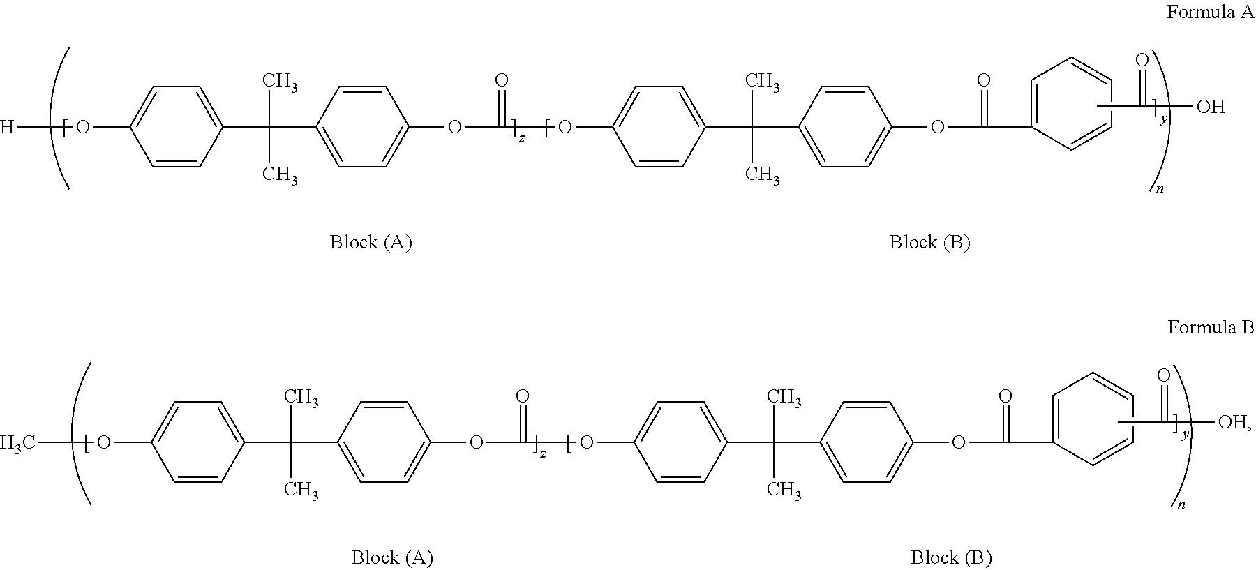 - the A-B diblock copolymer selected for use comprises a bisphenol A polycarbonate segment block (A) and a phthalic acid containing segment block (B) terminal. Specific embodiments are shown below by Formulas A and B and are polymers available from Sabic Innovative Plastics (Pittsfield, Mass.) having a Mw of 115,000.