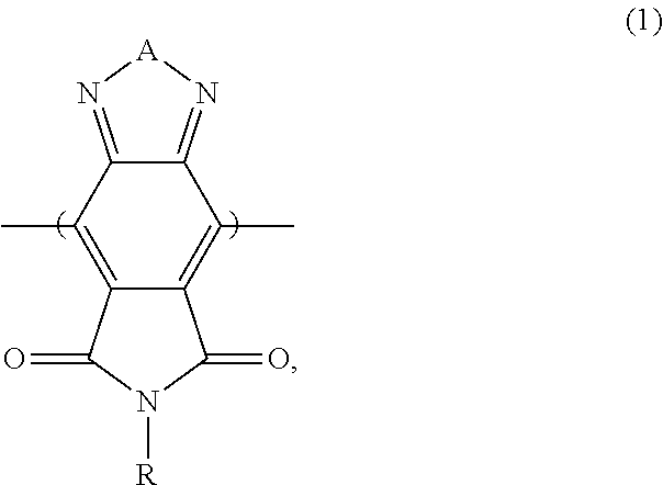 For example, the moieties of formulas (2)-(23) can be one of the following monomer repeat units: a benzodithiophene moiety of formula (24), a benzodithiophene moiety of formula (25), a cyclopentadithiazole moiety of formula (26), a benzothiadiazole moiety of formula (27), a thiadiazoloquinoxaline moiety of formula (28), a benzoisothiazole moiety of formula (29), a benzothiazole moiety of formula (30), a dithienopyrrole moiety of formula (31), a dibenzosilole moiety of formula (32), a thienothiophene moiety of formula (33), a carbazole moiety of formula (34), a dithienothiophene moiety of formula (35), a fluorene moiety of formula (36), a silole moiety of formula (37), a cyclopentadithiophene moiety of formula (38), a thiazole moiety of formula (39), a selenophene moiety of formula (40), a thiazolothiazole moiety of formula (41), a naphthothiadiazole moiety of formula (42), a thienopyrazine moiety of formula (43), a silacyclopentadithiophene moiety of formula (44), a thiophene moiety of formula (45), an oxazole moiety of formula (46), an imidazole moiety of formula (47), a pyrimidine moiety of formula (48), a benzoxazole moiety of formula (49), a benzimidazole moiety of formula (50), a quinoxaline moiety of formula (51), a pyridopyrazine moiety of formula (52), a pyrazinopyridazine moiety of formula (53), a pyrazinoquinoxaline moiety of formula (54), a thiadiazolopyridine moiety of formula (55), a thiadiazolopyridazine moiety of formula (56), a benzooxadiazole moiety of formula (57), an oxadiazolopyridine moiety of formula (58), an oxadiazolopyridazine moiety of formula (59), a benzoselenadiazole moiety of formula (60), a benzobisoxazole moiety of formula (61), a benzobisoxazole moiety of formula (62), a tetrazine moiety of formula (63), or a tetrafluorobenzene moiety of formula (64):