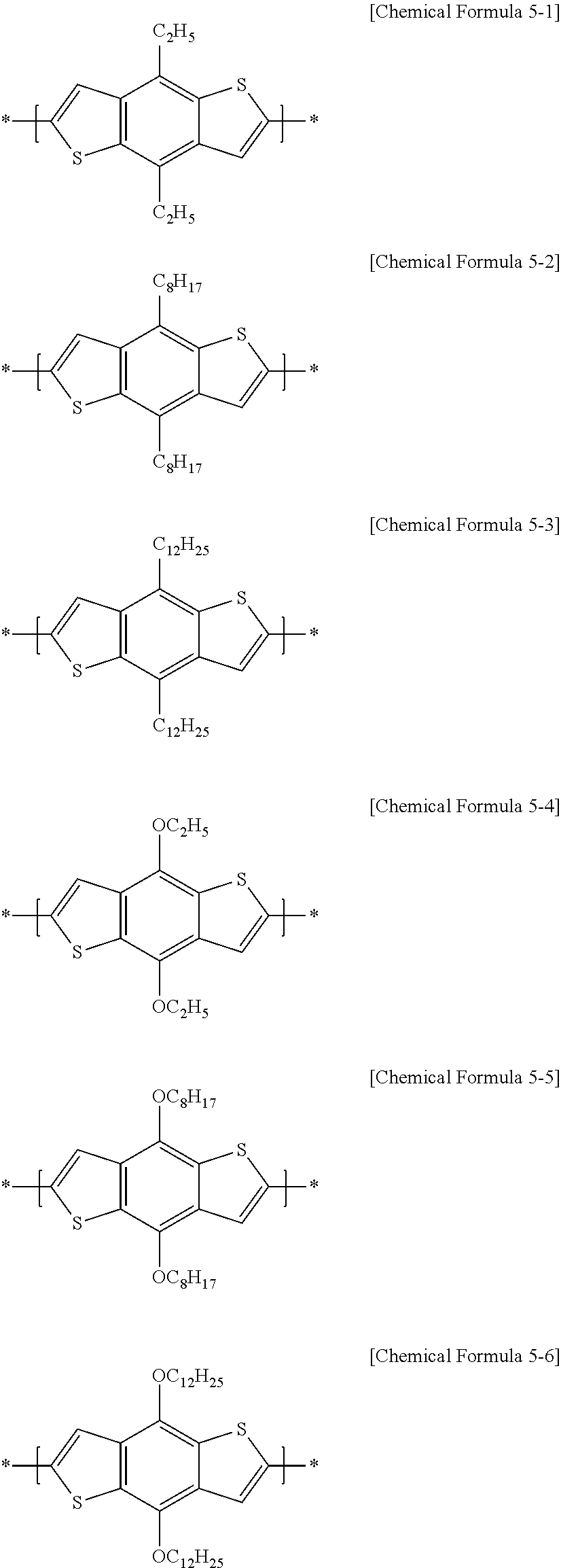 In Chemical Formulae 9-1 and 9-2, X3 is the same or different in each repeating unit, and each is independently an electron-accepting group including two ester residual groups and a substituted or unsubstituted divalent aliphatic organic group linking the ester residual groups. X4 is the same or different in each repeating unit, and each is independently hydrogen, a halogen, or a substituted or unsubstituted C1 to C20 alkyl group, and hydrogen.