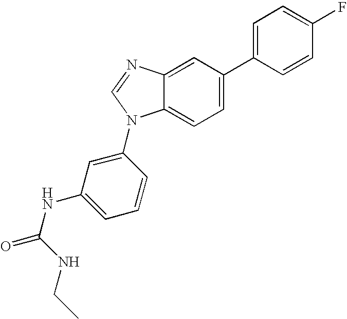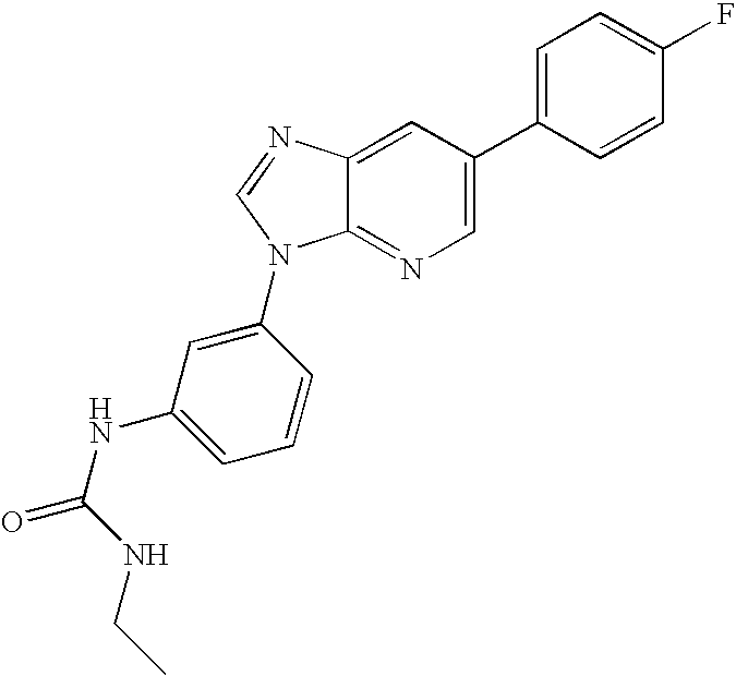 Enzymes (from Upstate) were prepared at 2× final concentration in 1× kinase assay buffer (as described below). Enzymes were then incubated with test compounds, biotinylated Flt3 substrate (biotin—DNEYFYV) (Cell Signalling Technology Inc.) and ATP. The reaction was allowed to proceed for 3 hours (FGFR3) or 2.5 hrs (PDGFR-beta) at room temperature on a plate shaker at 900 rpm before being stopped with 20 μl of 35 mM EDTA, pH 8 (FGFR3) or 55 mM EDTA, pH 8 (PDGFR-beta). Twenty μl of 5× detection mix (50 mM HEPES pH 7.5, 0.1% BSA, 2 nM Eu-anti-pY (PY20) (PerkinElmer) 15 nM SA-XL665 (Cisbio) for FGFR3 and 50 mM HEPES, pH 7.5, 0.5 M KF, 0.1% BSA, 11.34 nM Eu-anti-pY (PT66) (PerkinElmer), 94 nM SA-XL665 (Cisbio) for PDGFR-beta) was then added to each well and the plate sealed and incubated at room temperature for one hour on a plate shaker at 900 rpm. The plate was then read on a Packard Fusion plate reader in TRF mode.