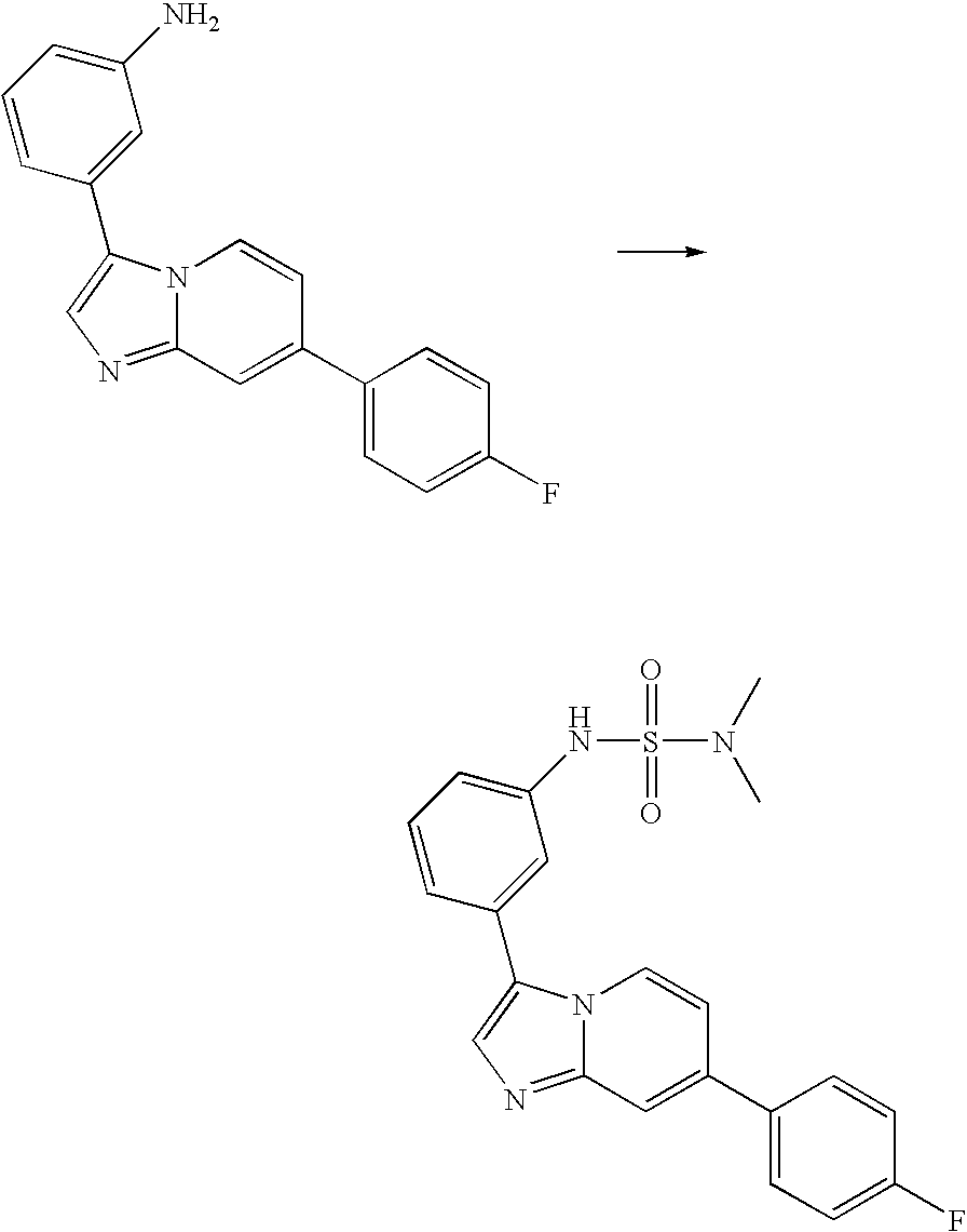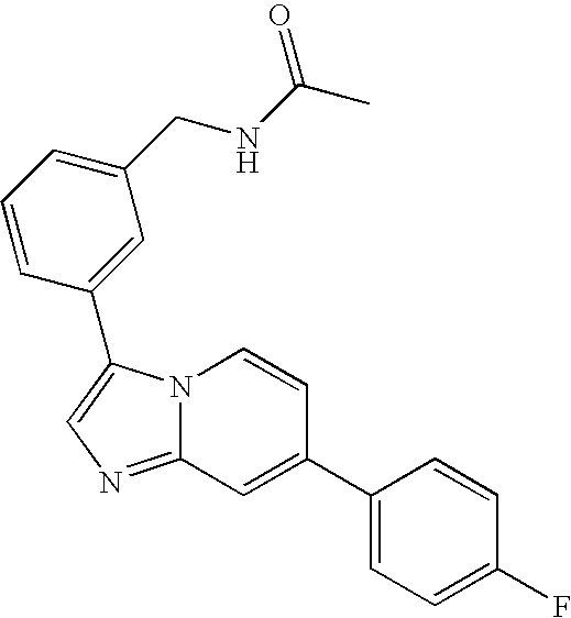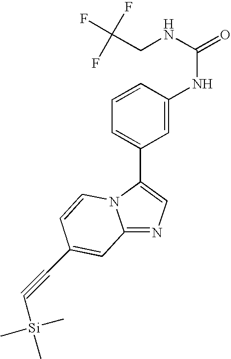 | 421 | | 1-{3-[7-(6- Methyl- pyridazin-3-yl)- imidazo[1,2- a]pyridin-3- yl]-phenyl}- 3-(2,2,2- trifluoro- ethyl)-urea hydrochloride | General route A steps A1-A3, procedure A3b using I6 [3-(4,4,5,5- Tetramethyl- [1,3,2]dioxaborolan- 2-yl)-phenyl]-3- (2,2,2-trifluoro- ethyl)-urea, procedure E2 and procedure E3b using 3-chloro-6- methylpyridazine. Procedure J1. | 1H NMR (400 MHz, DMSO-d6): 9.34 (1H, s), 8.93 (1H, d), 8.72 (1H, s), 8.51 (1H, d), 8.47 (1H, s), 8.26 (1H, dd), 7.93 (1H, s), 7.85 (1H, d), 7.61-7.51 (2H, m), 7.39-7.31 (1H, m), 7.11-7.02 (1H, m), 4.02-3.90 (2H, m), 2.75 (3H, s). | [M + H]+ 427 |
