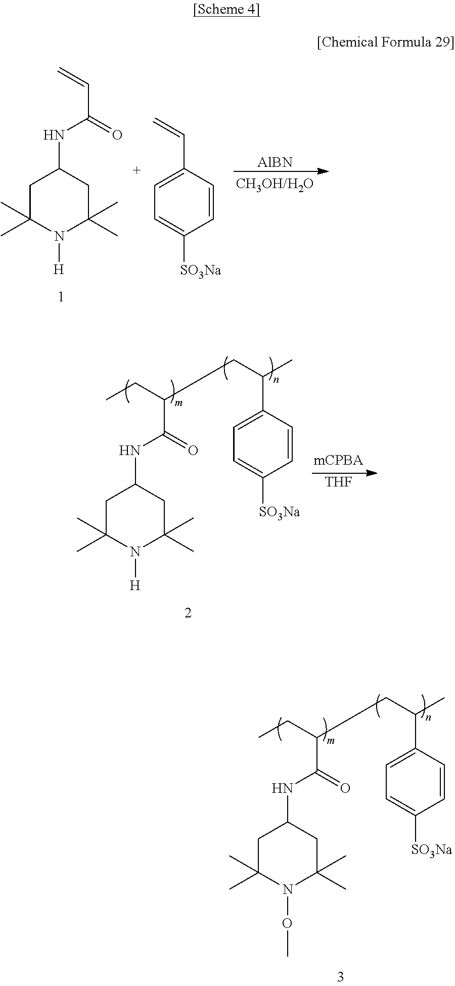 In the reaction procedure shown in Scheme 4 below, PTAM-PSS was synthesized. PTAM-PSS (poly(tetramethylpiperidinoxy)acrylamide-poly(sodium styrenesulfonate)) was a preferred example of the water-soluble polymer of a nitroxide radical compound having an organic acid salt or an organic base salt.