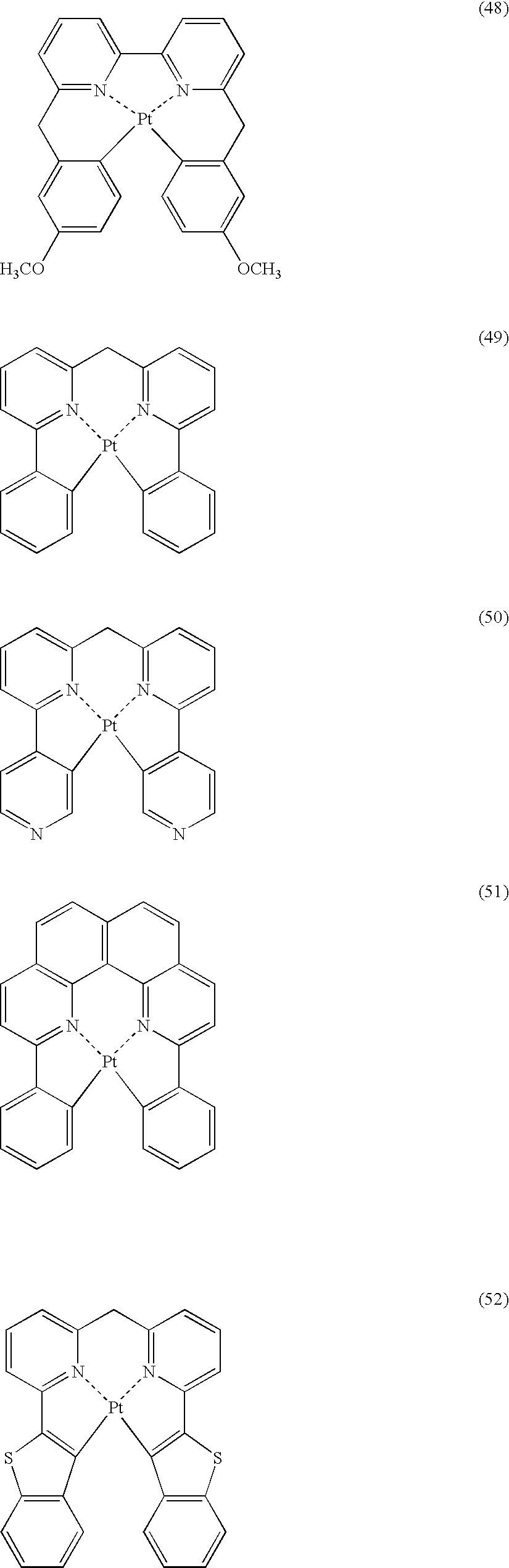 Among these, examples of the complex suitably used for a luminescent material include the phosphorescent compounds described in U.S. Pat. Nos. 6,303,238, 6,097,147, WO00/57676, WO00/70655, WO01/08230, WO01/39234, WO01/41512, WO02/02714, WO02/15645, WO02/44189, JP-A No. 2001-247859, JP-A No. 2000-33561, JP-A No. 2002-117978, JP-A No. 2002-225352, JP-A No. 2002-235076, JP-A No. 2001-239281, JP-A No. 2002-170684, EP 1211257, JP-A No. 2002-226495, JP-A No. 2002-234894, JP-A No. 2001-247859, JP-A No. 2001-298470, JP-A No. 2002-173674, JP-A No. 2002-203678, JP-A No. 2002-203679, JP-A No. 2002-203679, JP-A No. 2004-357791, JP-A No. 2006-256999, and JP-A 2005-75341.