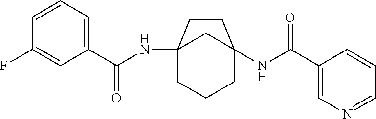 - DFQRBWHAAXHFPF-UHFFFAOYSA-N n-[5-[(3-methylbenzoyl)amino]-1-bicyclo[3.2.1]octanyl]pyridine-3-carboxamide Chemical compound CC1=CC=CC(C(=O)NC23CC(CC2)(CCC3)NC(=O)C=2C=NC=CC=2)=C1 DFQRBWHAAXHFPF-UHFFFAOYSA-N 0.000 claims description 4