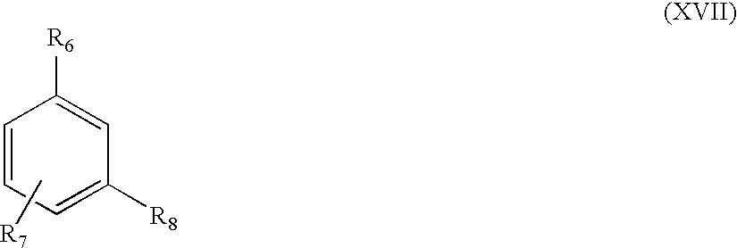 - individually and independently in any of formulas (III) to (VII), 0, 1, 2, 3 or 4 ring carbon atoms are hetero atoms which are individually and independently selected from the group comprising N, O and S;