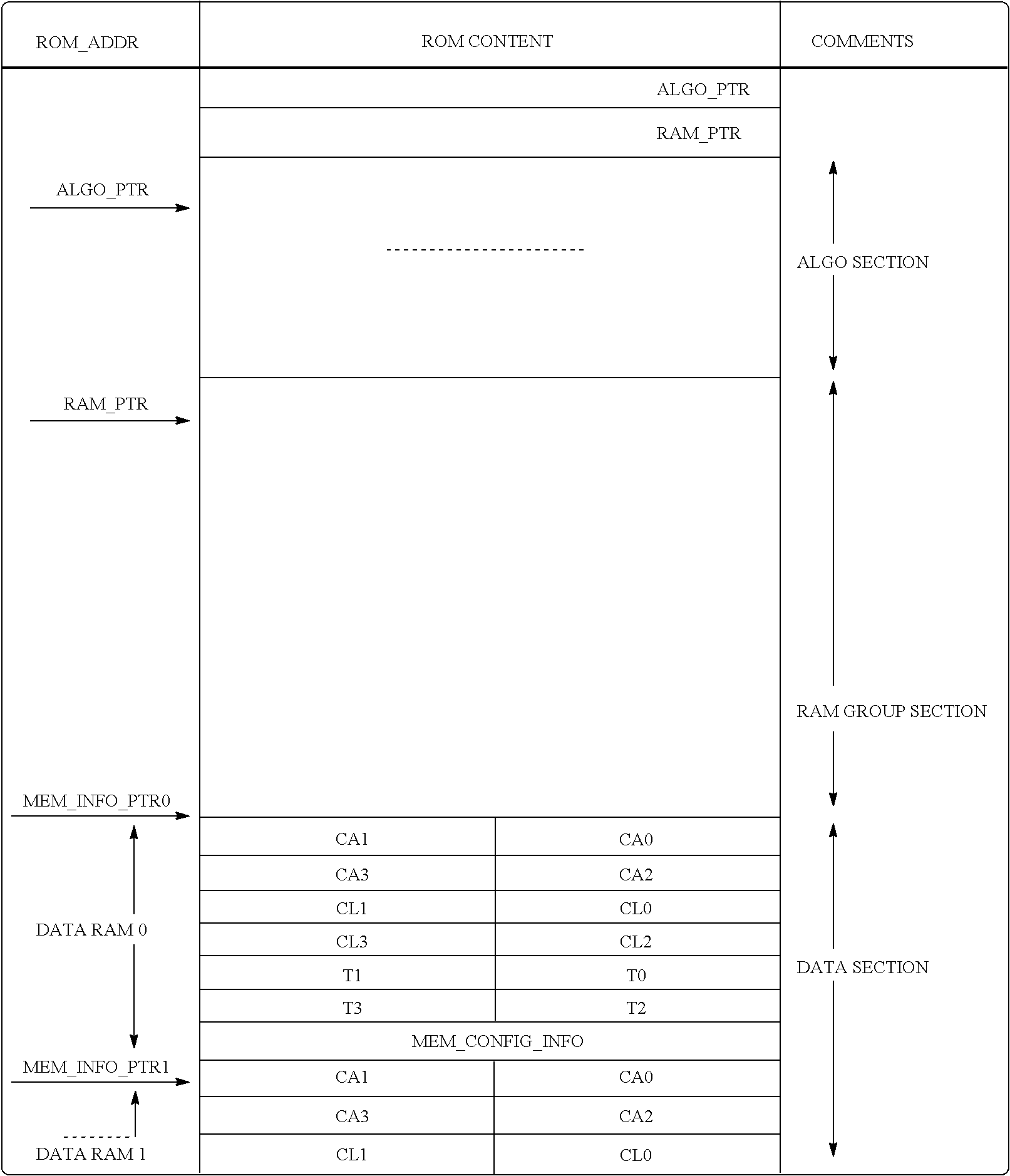 In the prior art, the pBIST ROM stored the configuration data separately for each RAM block as shown in Table 1 where the ROM is divided into two sections. The first location stores the pointer to the beginning of the algorithm section (ALGO_PTR), and the second location stores the pointer to the beginning of the RAM Group Section. The algorithm section stores the test algorithm for the selected RAM, and the RAM Group Section stores the constants required for testing the selected RAM block. Table 2 shows the contents of the Ram Group Section.