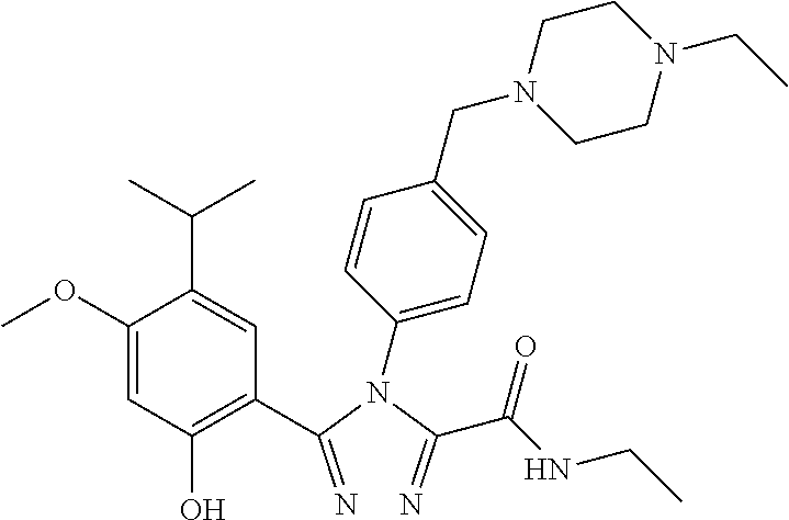 The HSP90 inhibitor, 17-allylamino-17-demethoxygeldanamycin (17-AAG), can be employed as a positive control (Albany Molecular Research, Albany, N.Y., USA). Stock solutions of test articles are prepared by dissolving the appropriate amounts of each compound in dimethyl sulfoxide (DMSO) by sonication in an ultrasonic water bath. Stock solutions are prepared weekly, stored at −20° C. and diluted fresh each day for dosing. A solution of 20% Cremophore RH40 (polyoxyl 40 hydrogenated castor oil; BASF Corp., Aktiengesellschaft, Ludwigshafen, Germany) in 80% D5W (5% dextrose in water; Abbott Laboratories, North Chicago, Ill., USA) is also prepared by first heating 100% Cremophore RH40 at 50-60° C. until liquefied and clear, diluting 1:5 with 100% D5W, reheating again until clear and then mixing well. This solution is stored at room temperature for up to 3 months prior to use. To prepare formulations for daily dosing, DMSO stock solutions are diluted 1:10 with 20% Cremophore RH40. The final formulation for dosing contains 10% DMSO, 18% Cremophore RH40, 3.6% dextrose, 68.4% water and the appropriate amount of test article. Animals are intraperitoneally (i.p.) injected with this solution at 10 ml per kg body weight on a schedule of 5 days per week (Monday, Tuesday, Wednesday, Thursday and Friday, with no dosing on Saturday and Sunday) for a total of 15 doses.