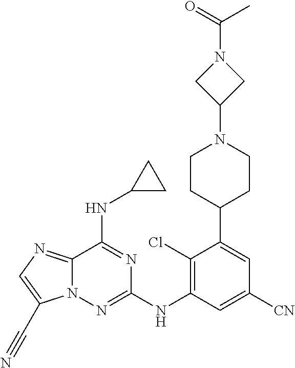 TFA (25% in DCE, 2 ml, 6.49 mmol) was added to a solution of 2-((2-chloro-5-cyano-3-((1-(oxetan-3-yl)piperidin-4-yl)oxy)phenyl)amino)-4-(cyclopropyl(4-methoxybenzyl)amino)imidazo[2,1-f][1,2,4]triazine-7-carbonitrile (50 mg, 0.080 mmol) and anisole (0.035 ml, 0.319 mmol) in DCE (1 mL) and the reaction mixture was heated at 45° C. for 3 hours. Solvent was evaporated in vacuo and the residue was dried under vacuum overnight. The residue was washed with hexane (2×2 ml), dissolved in acetonitrile (2 ml) and 2N ammonia in methanol was added to give a suspension. Solvent was evaporated until a very small amount and the precipitate was collected by filtration. 2-((2-chloro-5-cyano-3-((1-(oxetan-3-yl)piperidin-4-yl)oxy)phenyl)amino)-4-(cyclopropylamino)imidazo[2,1-f][1,2,4]triazine-7-carbonitrile (27 mg) was obtained as a white solid.
