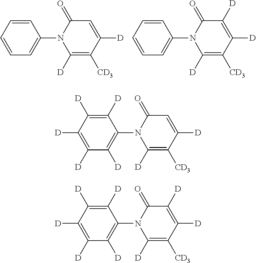 Liver microsomal stability assays were conducted with 0.2 mg per mL liver microsome protein in a NADPH-generating system (2% sodium bicarbonate, 2.2 mM NADPH, 25.6 mM glucose 6-phosphate, and 6 units per mL glucose 6-phosphate dehydrogenase and 3.3 mM MgCl2). The test compounds were solubulized in 20% acetonitrile-water. The test compound solution was then added to the assay mixture (final assay concentration 1 μM) and the mixture was incubated at about 37° C. The final concentration of acetonitrile in the assay should be <1%. Aliquots (50 μL) were collected at times 0, 15, 30, 45, 60, 90 and 120 min, and diluted with ice cold acetonitrile (200 μL) (to quench the reactions). The aliquots were centrifuged at about 12,000 RPM for about 10 min to precipitate the proteins. The supernatants were then collected and transferred to micro centrifuge tubes for LC/MS/MS analysis of degradation half-lives. It can be predicted that the compounds as disclosed herein, when tested in this assay, will demonstrate an increase of at least 5% or more in the degradation half-life, as compared to the non-isotopically enriched drug. For example, the degradation half-lives of any of the deuterated compounds as described in the Example section should show improvement in degradation half-lives between 5-600% respectively, as compared to non-isotopically enriched pirfenidone.