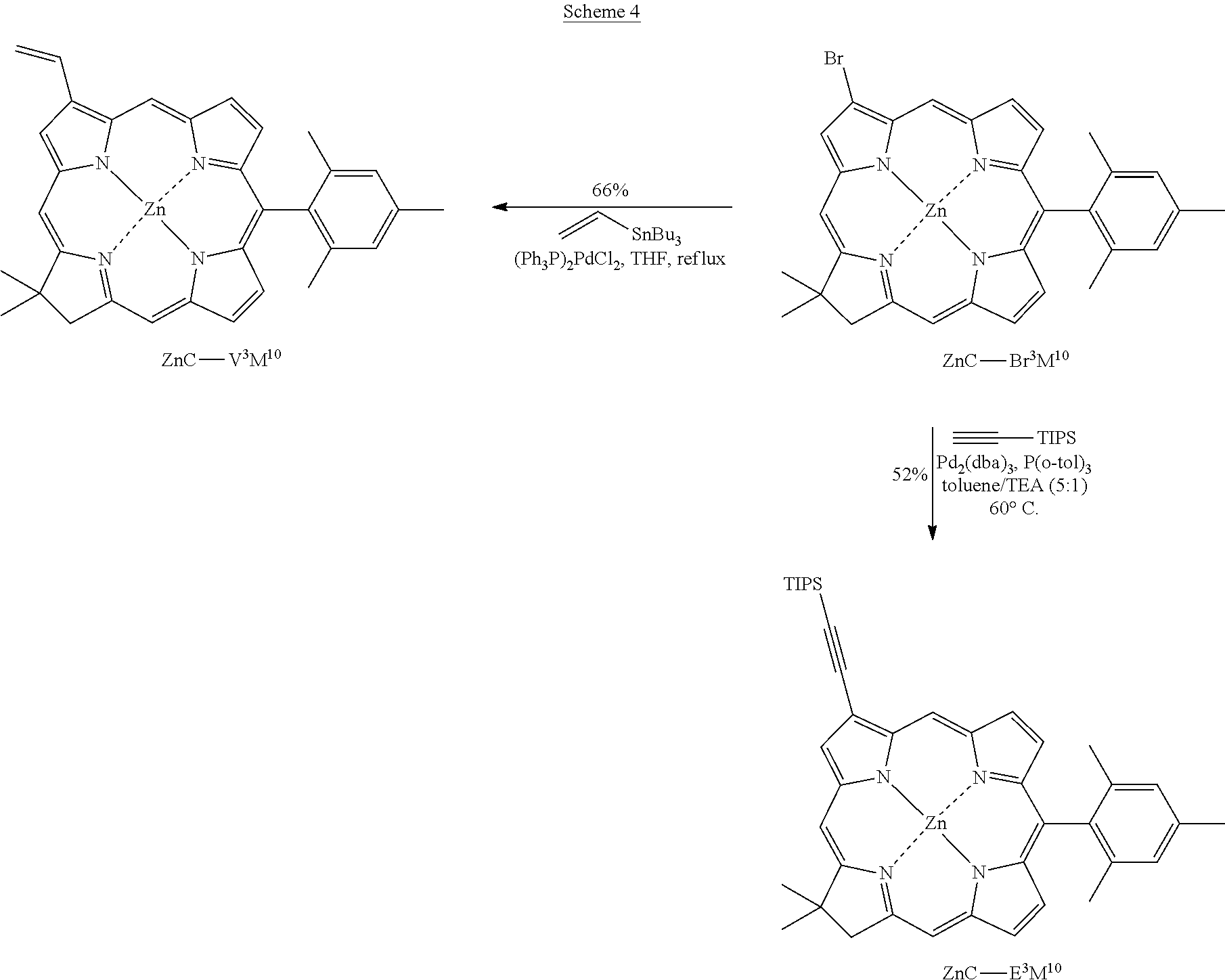 Samples of ZnC—Br3M10Br13 (25 mg, 0.036 mmol) and (triisopropylsilyl)acetylene (16 μL, 0.072 mmol) were coupled using Pd2(dba)3 (5.0 mg, 0.0055 mmol), and P(o-tol)3 (14 mg, 0.046 mmol) in toluene/triethylamine (5:1, 9 mL) at 60° C. under argon. After 20 h, (triisopropylsilyl)acetylene (16 μL, 0.072 mmol), Pd2(dba)3 (5.0 mg, 0.0055 mmol), and P(o-tol)3 (14 mg, 0.046 mmol) were added to the reaction mixture. After 32 h, the reaction mixture was concentrated under reduced pressure. The resulting residue was chromatographed [silica, hexanes/CH2Cl2 (2:1)], affording a green solid (24 mg, 75%): 1H NMR δ 1.38 (s, 18H), 1.40 (s, 24H), 1.86 (s, 6H), 2.03 (s, 6H), 2.61 (s, 3H), 4.52 (s, 2H), 7.24 (s, 2H), 8.34 (d, J=3.9 Hz, 1H), 8.50 (s, 1H), 8.56 (s, 1H), 8.80 (d, J=3.9 Hz, 1H), 8.83 (s, 1H), 8.99 (s, 1H), 9.81 (s, 1H), LD-MS obsd 880.4; FAB-MS obsd 880.4321, calcd 880.4274 (C53H68N4Si2Zn); λabs 423, 646 nm.