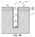 As shown in FIG. 4B, the bulk fill material 680 may be trimmed, using etching and/or planarization processes, to leave an exposed surface 682 on the bulk fill material 680 and expose an excess portion of the conformal liner 660 and an excess portion of the electrode layer 670. The excess portion of the conformal liner 660 and/or the excess portion of the electrode layer 670 may be doped using energetic charged particles to form doped regions (not shown) and then may be etched to remove the doped regions. The doped regions may or may not extend through the thickness of the conformal liner 660 or the electrode layer 670. Furthermore, the dopant may be selected such that the introduction of the dopant to the conformal liner 660 and/or the electrode layer 670 decreases an etch resistance of the conformal liner 660 and/or the electrode layer 670 to a pre-determined etch process, while the introduction of the dopant to the bulk fill material 680 increases an etch resistance of the bulk fill material 680 to the pre-determined etch process. Protection of the bulk fill material during the removal of the conformal liner 660 and/or the electrode layer 670 may reduce or prevent the formation of a recess at the exposed surface 682. The doping and etching may be alternatingly and sequentially performed until the excess portion 662 of the conformal liner 660 and/or the excess portion of the electrode layer 670 are removed.