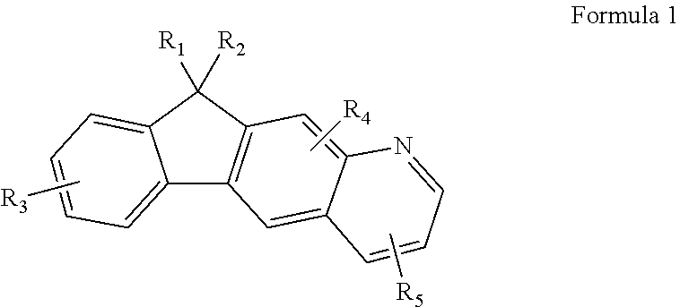 In Formula 1, R1 to R5 may each independently be selected from the group of a hydrogen atom, a heavy hydrogen atom, a substituted or unsubstituted C1-C60 alkyl group, a substituted or unsubstituted C2-C60 alkenyl group, a substituted or unsubstituted C2-C60 alkynyl group, a substituted or unsubstituted C3-C60 cycloalkyl group, a substituted or unsubstituted C1-C60 alkoxy group, a substituted or unsubstituted C5-C60 aryloxy group, a substituted or unsubstituted C5-C60 arylthio group, a substituted or unsubstituted C5-C60 aryl group, an amino group substituted with a C5-C60 aryl group or a C3-C60 heteroaryl group, a substituted or unsubstituted C3-C60 heteroaryl group, a substituted or unsubstituted C6-C60 condensed polycyclic group, a halogen atom, a cyano group, a nitro group, a hydroxy group, and a carboxy group.