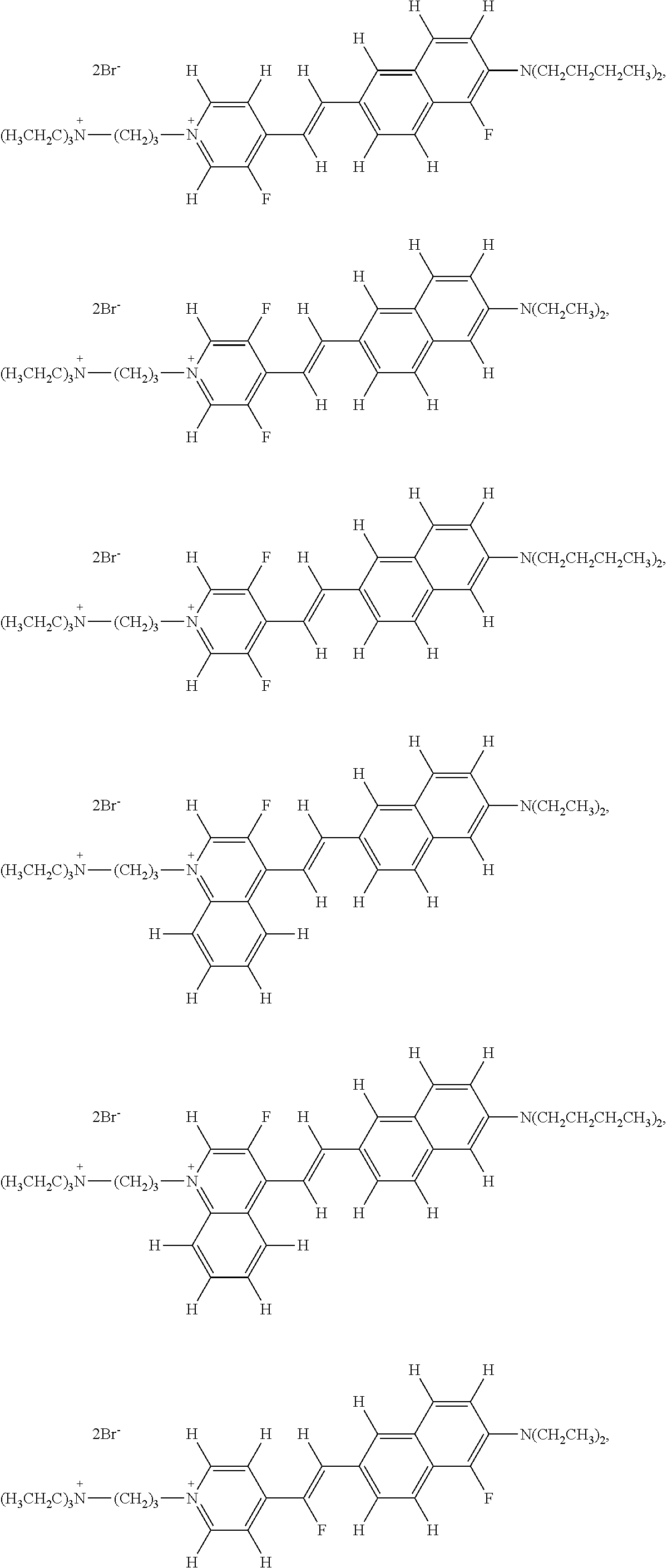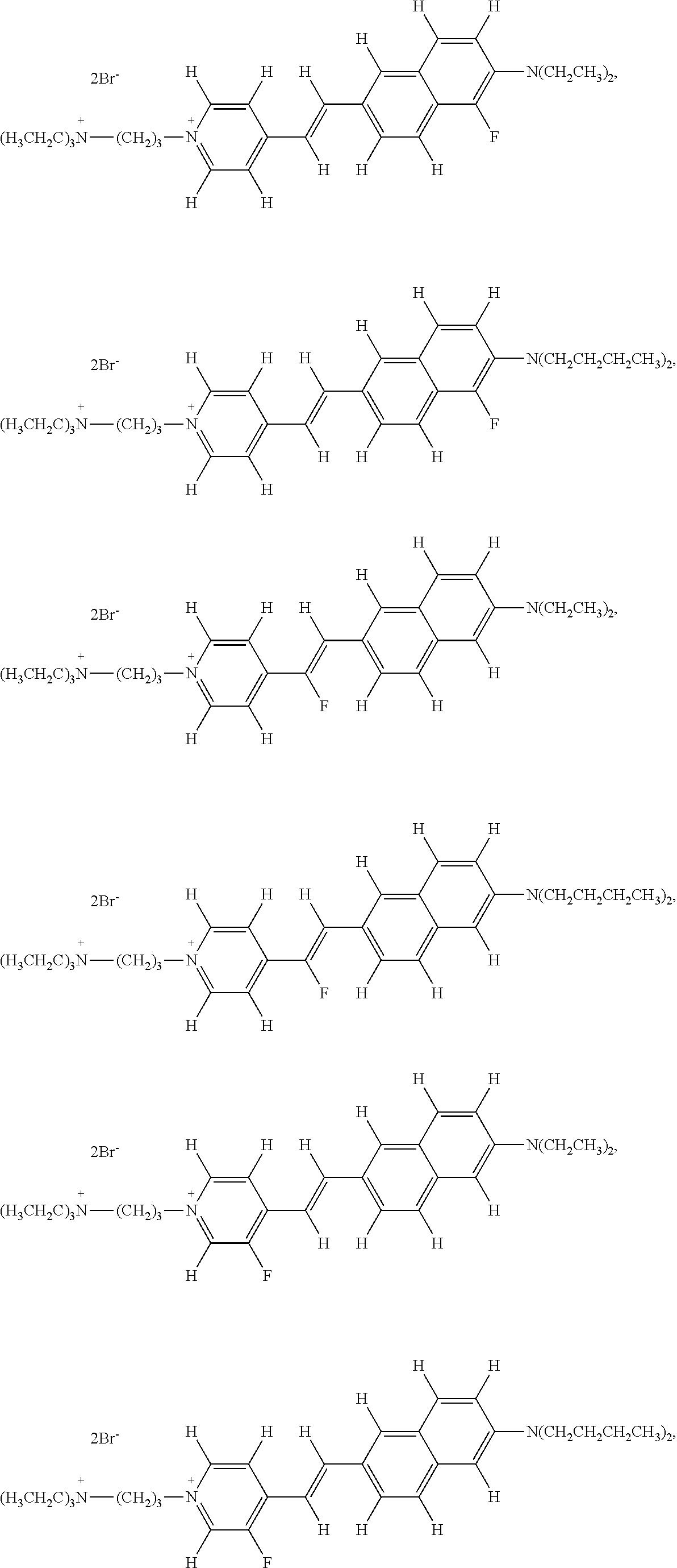 - WZVKKPIQOZUKBN-UHFFFAOYSA-N CCCCN(CCCC)C1=C/C2=CC=C(/C=C/C3=CC=[N+](CCC[N+](CC)(CC)CC)C=C3F)C=C2/C=C\1 Chemical compound CCCCN(CCCC)C1=C/C2=CC=C(/C=C/C3=CC=[N+](CCC[N+](CC)(CC)CC)C=C3F)C=C2/C=C\1 WZVKKPIQOZUKBN-UHFFFAOYSA-N 0.000 description 1