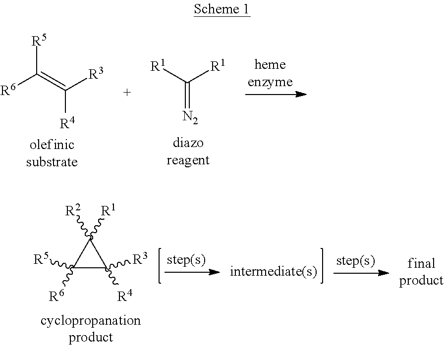 - (a) providing an olefinic substrate, a diazo reagent, and a heme enzyme; and