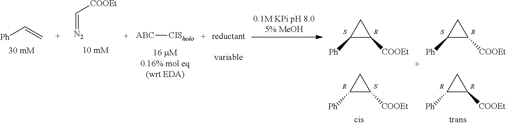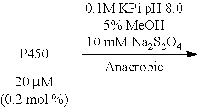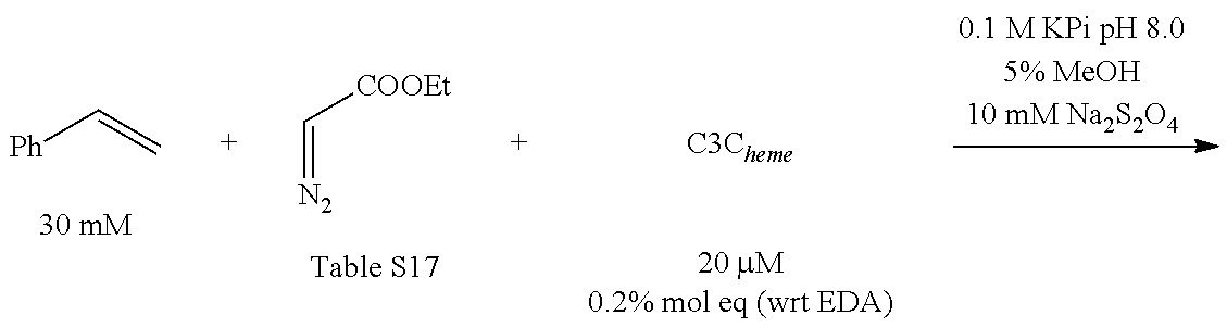 Reactions (400 μL) were conducted in 2 mL crimp vials (Agilent Technologies, San Diego, Calif.). P450 solution (80 μL, 100 μM) was added to the vial with a small stir bar before crimp sealing with a silicone septum. Phosphate buffer (260 μL, 0.1 M, pH=8.0) and 40 μL of a solution of the reductant (100 mM Na2S2O4) were combined in a larger crimp-sealed vial and degassed by bubbling argon through the solution for at least 5 min. In the meantime, the headspace of the 2 mL reaction vial with the P450 solution was made anaerobic by flushing argon over the protein solution (with no bubbling). When multiple reactions were conducted in parallel, up to 8 reaction vials were degassed in series via cannulae. The buffer/reductant solution (300 μL) was syringed into the reaction vial, while under argon. The gas lines were disconnected from the reaction vial before placing the vials on a plate stirrer. A styrene solution in MeOH (10 pt, 800 mM) was added to the reaction vial via a glass syringe, and left to stir for about 30 s. A EDA solution in MeOH was then added (10 μL, 340 mM) and the reaction was left shaking for 16 h at room temperature. The final concentrations of the reagents were: 20 mM styrene, 8.5 mM EDA, 10 mM Na2S2O4, 20 μM P450.