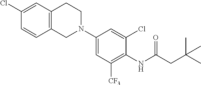 - JURDKTFYHWIOLE-UHFFFAOYSA-N CC(C)(C)CC(=O)NC1=C(C(F)(F)F)C=C(N2CCC3=C(C=CC=C3)C2)C=C1Cl Chemical compound CC(C)(C)CC(=O)NC1=C(C(F)(F)F)C=C(N2CCC3=C(C=CC=C3)C2)C=C1Cl JURDKTFYHWIOLE-UHFFFAOYSA-N 0.000 description 2