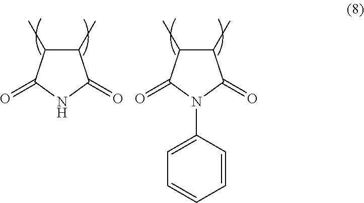 In 35.7 g of 2-butanone, 7.5 g of maleimide, 15 g of N-phenylmaleimide, and 1.4 g of dimethyl 2,2′-azobis(isobutyrate) were dissolved, and then the solution was added dropwise over 2 hours into a flask in which 59.5 g of 2-butanone was heated and refluxed. After the completion of the dropwise addition, the whole was reacted for 2 hours. After cooling the reaction solution to room temperature, the solution was poured into a hexane/diethyl ether mixed solvent to reprecipitate a polymer, and the precipitate was dried under reduced pressure to provide a polymer (copolymer) having a structural unit of Formula (8).