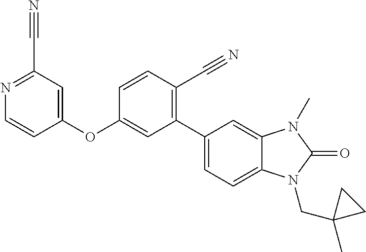 4-{4-cyano-3-[1-(2,2- dimethylpropyl)-4- fluoro-3-methyl-2-oxo- 2,3-dihydro-1H- benzimidazol-5- yl]phenoxy}pyridine-2- carbonitrile |