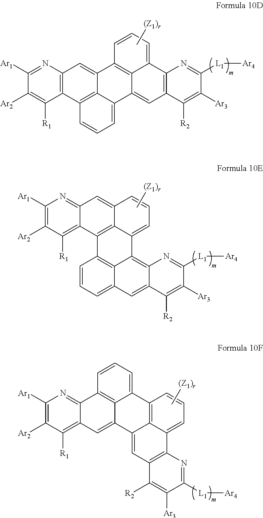 In Formulae 3A and 3B, A forms a skeleton together with a pyridine group, and may be a substituted or unsubstituted naphthalene ring, a substituted or unsubstituted pentalene ring, a substituted or unsubstituted indene ring, a substituted or unsubstituted azulene ring, a substituted or unsubstituted heptalene ring, a substituted or unsubstituted indacene ring, a substituted or unsubstituted acenaphthalene ring, a substituted or unsubstituted fluorene ring, a substituted or unsubstituted spiro-fluorene ring, a substituted or unsubstituted phenalene ring, a substituted or unsubstituted phenanthrene ring, a substituted or unsubstituted anthracene ring, a substituted or unsubstituted fluoranthene ring, a substituted or unsubstituted triphenylene ring, a substituted or unsubstituted pyrene ring, a substituted or unsubstituted chrysene ring, a substituted or unsubstituted naphthacene ring, a substituted or unsubstituted tetrahelicene ring, a substituted or unsubstituted picene ring, a substituted or unsubstituted perylene ring, a substituted or unsubstituted pentaphene ring, a substituted or unsubstituted benzopyrene ring, a substituted or unsubstituted hexacene ring, or a combination thereof.